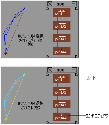 IK ハンドルをクリックしてアクティブにします。以下は、IK ハンドルがモデリングビュー(左側)と SBD ウィンドウ(右側)にどのように表示されるかを示します。
