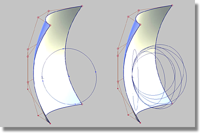 上のイメージで一覧表示されている Curvature Evaluation Type の設定では、各ポイントにおけるサーフェスの曲率を計算します。この計算は、各ポイントでサーフェスに接する円の直径を計測します。同じ直径の円を持つポイントは、同じカラーで表示されます。各ポイントは複数の円を持つことができます。Curvature Evaluation Type 設定は、計算に使用する円を指定します。