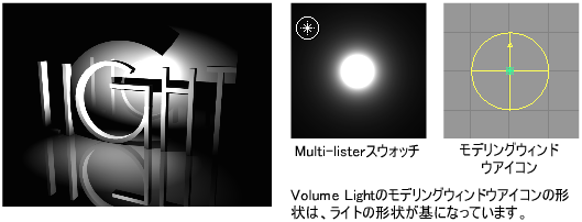 ボリューム ライトは閉じた空間領域を定義します。ここで定義した空間領域内にあるオブジェクトはボリューム ライトにより照らされますが、外側にあるものは一切照らされません。