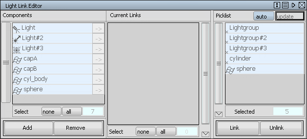 Components リストには、Link Editor を開いたときにアクティブなライトとサーフェスがすべてコンポーネント レベルで表示されます (アクティブなコンポーネントの選択をモデリング ウィンドウで解除した場合、そのコンポーネントは Components リストに表示はされますが強調表示されなくなります)。Components リストで強調表示されているライトとサーフェスは、Picklist に表示されます。このリストで、コンポーネントをクリックして選択したり、選択を解除したりできます。Picklist の auto ボタンがオンになっていれば、この選択内容は Picklist で自動的に更新されます。