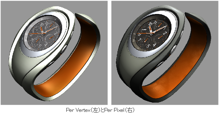 Per vertex は、以前に Alias で利用可能だったものと同じ品質のシェーディング モードを提供します。モデリング中にサーフェスをすばやく近似するには、Per vertex を選択します。Per Pixel は、RayCaster で得られる外観に近いハイライトを提供します。ただし、このモードをサポートするグラフィックス カードが必要です。認定グラフィックス カードの詳細については、「認定グラフィックス ハードウェア」を参照してください。