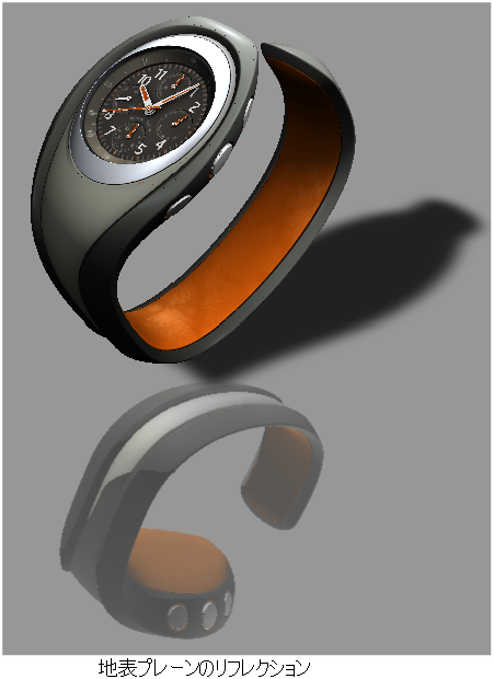 Hardware Shade モードで地表プレーン、地表プレーン シャドウ、およびグラウンド プレーン リフレクションを有効化します。オプションは、Environment エディタの Ground Plane セクションにあります。