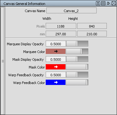 Canvas General Information ウィンドウを開きます(または閉じます)。このウィンドウには、キャンバス レイヤのプロパティに関するコンテキストに応じた情報が表示されます。詳細については、下記を参照してください。