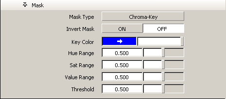 Image File の特定のカラーや色の範囲をマスキングする場合は、Mask Type を Chroma-Key に設定します。Key Color、Hue Range、Sat Range、Value Range、Threshold のパラメータが使用できるようになります。