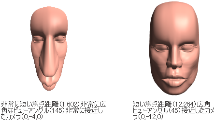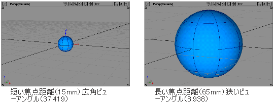 Focal Length を短くすれば Angle of View は広くなります(たとえば、カメラの広角レンズ)。カメラに近いオブジェクトが小さく、遠く離れて見えます。カメラに非常に近いオブジェクトが、カメラから少々離れたオブジェクトに比べて、極端に大きく見えることもあります。