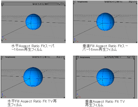 カメラのウィンドウにカメラビューをどのように表示するかを制御します。カメラのウィンドウのシェイプがカメラの Film Back と同じでない場合、ウィンドウの表示はカメラ ビューを一方向にのみ(Horizontal(水平)または Vertical(垂直))調整できます。既定の設定は Fill で、カメラ ビューがウィンドウに収まるようにカメラビューを(垂直または水平方向に)自動的に調整します。