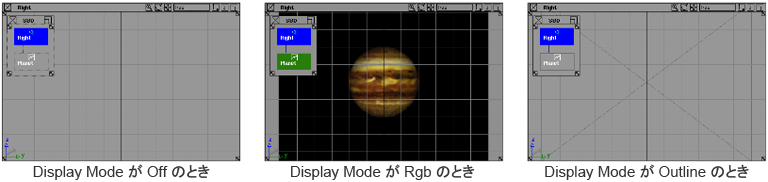 モデリング ウィンドウと SBD ウィンドウでのイメージ プレーンの表示方法を制御します。イメージ プレーンのレンダリングが実行されるのは、Display Mode が Rgb または Off の場合のみです。既定の設定は Rgb です。