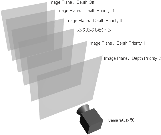イメージ プレーンをシーンの前面か背後、または他のイメージ プレーンの前面か背後のどちらに表示するかを定義します。Depth を Priority にすると、数値フィールドが使用可能になります。
