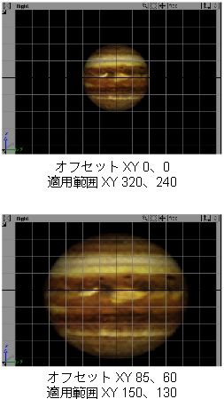 たとえば、イメージ プレーン ファイルが image.1、image.7、... image.33 と命名され、Offset 値が 7 の場合、image.1 は 1 + 7 = 8 フレーム目に表示され、image.7は 7 + 7 = 14 フレーム目に、...image.33 は 33 + 7 = 40 フレーム目に表示されます。さらに、image.1 はシーケンスの最初のイメージなのでフレーム 1~7 で、image.33 はシーケンスの最後のイメージなのでアニメーションの最後にフレーム 41 で表示されます。
