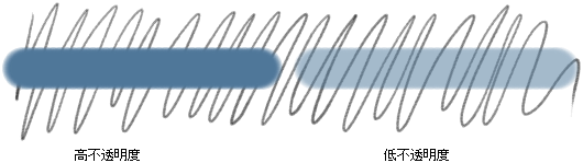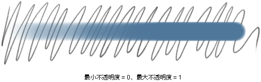 不透明度(Opacity)は、ブラシのペイントが「透き通って」いる度合いを表わします (不透明度は透明度の反対です)。不透明度 1 では、ペイントの下にあるものは何も見えません。不透明度が低くなればなるほど、ペイントを通して見える率が高くなります。不透明度が 0 であるペイントは、全く透明で目には見えません。
