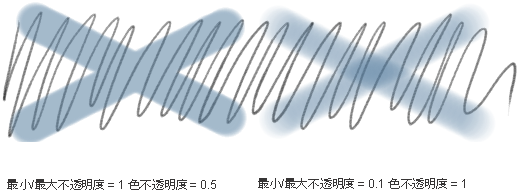 ブラシ不透明度は、スタイラスをタブレットに押す力(筆圧)でも変更できます。Min Opacity はブラシの最小の不透明度(スタイラスを軽く押す場合)、Max Opacity はブラシの最大の不透明度(スタイラスを強く押す場合)です。タブレットへのスタイラスの筆圧に応じて不透明度を変化させたくない場合は、Min Opacity と Max Opacity に同じ値を設定します。