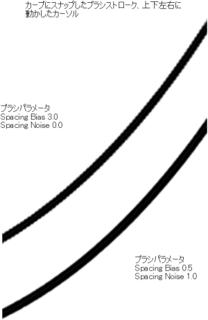 ブラシ スタンプの Spacing Bias を小さくするとブラシ ストロークの質を大幅に向上させることができますが、特定のポイントにおいては、Spacing Bias を小さくしてもストロークの質は向上せず、パフォーマンスが低下するだけになります。ブラシ スタンプの Spacing Bias を大きくするとブラシの速度が大幅に上がりますが、個々のブラシ スタンプの間隔が広すぎる場合、視覚的な外観が滑らかなストロークにならないことがあります。