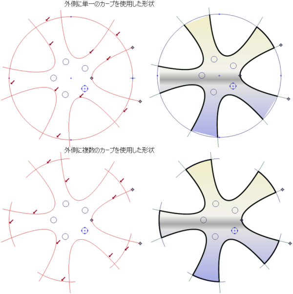 各カーブは、さまざまなシェイプを形成するために何度でも使用することができます。たとえば、下の車輪の例は、Ramp マスクやマスク シェイプを使ったイメージ シェイプを定義するために、カーブがどのように使用されているかを示します。