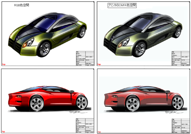 使用しているプリンタではどんな色がきれいに印刷されるかを学んでください。Alias の Print Preview ウィンドウを使用して、RGB 色空間と CMYK 色空間について理解を深めてください。この 2 つの色空間は異なるものです。以下は、RGB 色空間と CMYK 色空間の違いを示す簡単な例です。RGB から CMYK に切り替えると、印象的なスケッチが平坦でつまらないものに見えてしまうことに注意してください。世界のすべてのプリンタは、色相、彩度、明度の扱い方における固有の色空間を持っています。使用しているプリンタにはどんな色と彩度を使うとよいかを学んでください。画面に美しいスケッチを作成することに時間をかけないでください。印刷または電子的に投影するときれいな仕上がりにはなりません。