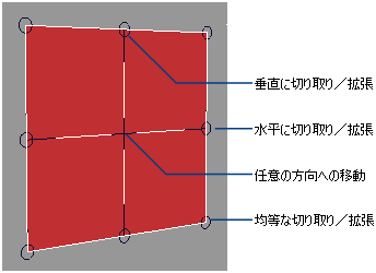 マニピュレータで示された新しい端に沿って、キャンバスが切り取り、拡張、または移動します。解像度(1 インチまたは 1cm あたりピクセル数)は変化しません。イメージ レイヤの内容のサイズは変わりませんが、その内容がキャンバスとともに切り取られます。