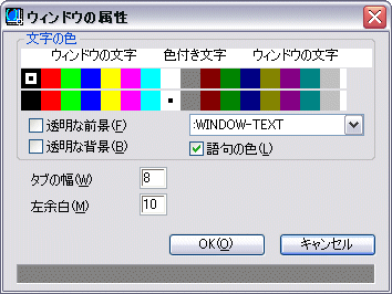 このダイアログ ボックスで、タブ幅や左余白のサイズを設定したり、現在のウィンドウ タイプに対して定義される各種の文字の色を設定したり、そのウィンドウに対する語句の色付けをコントロールできます(適用可能な場合)。色選択コントロールを使用して色を選択するには、設定したい色が表示されている長方形の中でマウスのボタンをクリックします。