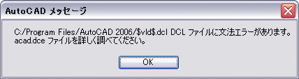 エラーが発生すると、エラーを警告する 1 つまたは複数のダイアログ ボックスが表示されるか、エラーのリストが acad.dceという名前のテキスト ファイルに書き込まれます。acad.dce にエラー メッセージが書き込まれた場合は、次のようなメッセージとともにこのことが警告されます。