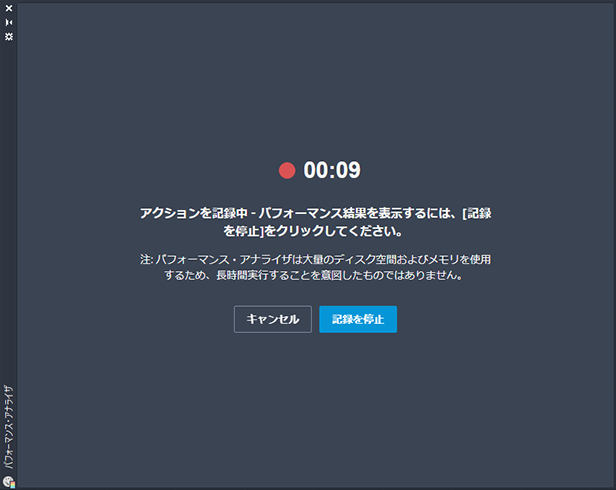 [パフォーマンス アナライザ]パレットが表示され、AutoCAD で遅かったり応答していないように見える動作を診断できます。