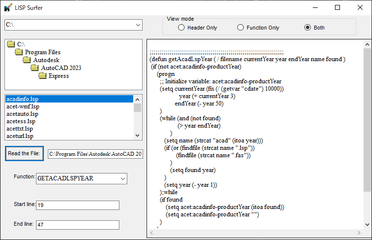 AutoLISP ファイルのコンテンツが個々の関数別に表示されます。