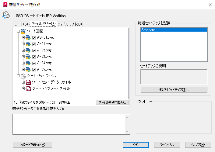 既定では、現在の図面に関連付けらていれるすべてのファイル(関連する外部参照、印刷スタイル、フォントなど)が一覧表示されます。転送パッケージに他のファイルを追加したり、既存のファイルを除外することができます。URL によって参照される関連ファイルは、転送パッケージには含まれません。