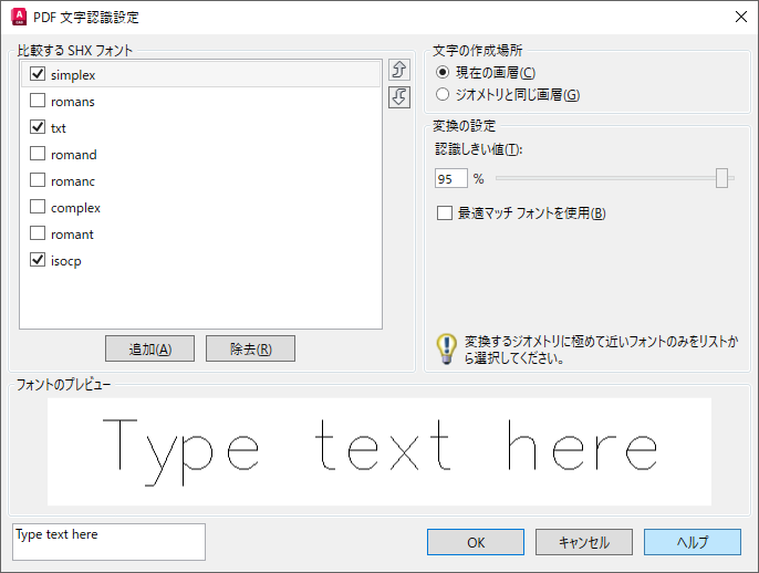 - 選択した SHX ジオメトリに一致する最も近いフォントを選択するための SHX フォントのリストが表示されます。選択した SHX フォントの順序は重要です。指定した認識しきい値に一致するか超えるまで、リストの上から順に、選択したフォントと選択した SHX ジオメトリが比較されます。選択したフォントをリストの上または下に移動するには、矢印コントロールを使用します。チェック マークの付いていないフォントは無視されます。次の点に注意してください。