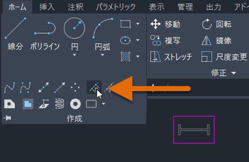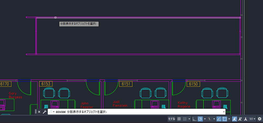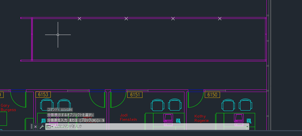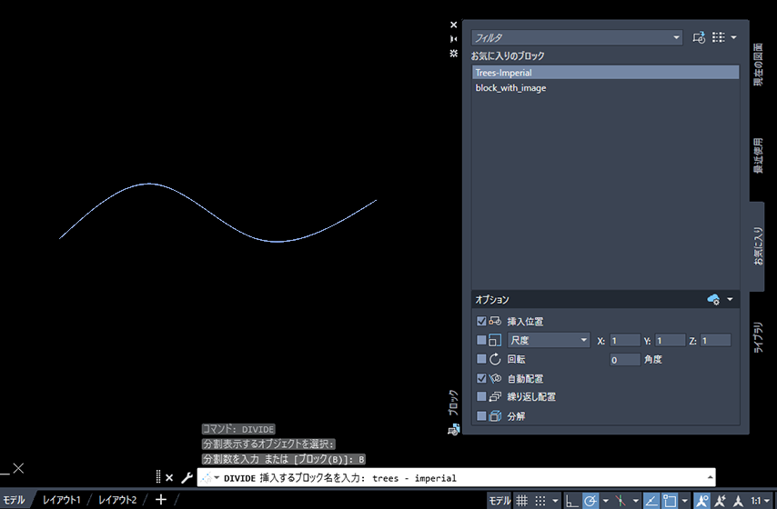 | DIVIDE[ディバイダ] | オブジェクトの長さまたは周長に沿って等間隔に、点オブジェクトまたはブロックを作成します。 |