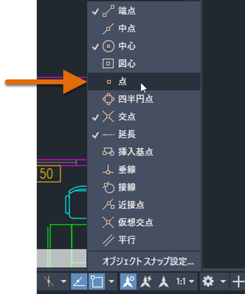 点が作成されたので、それらの点を取得できるように、[点]オブジェクト スナップ モードをオンにします。