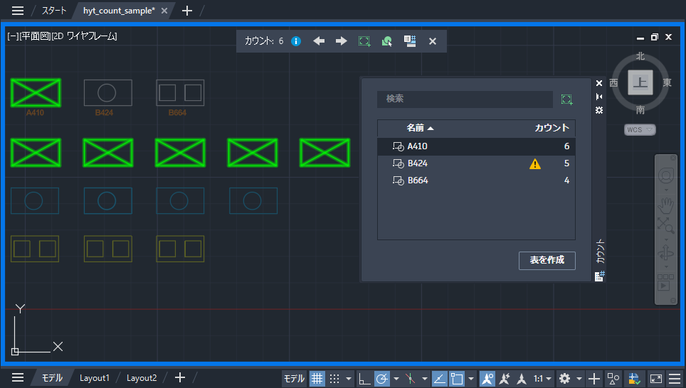 COUNTTABLE[カウント-表] | 図面内のブロック名とそれに対応する各ブロックの個数が記載された表を挿入します。 |