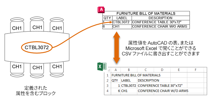 ブロックは、「属性定義」(「ブロック属性」とも呼ばれる)という特殊なオブジェクトを含むことができます。 部品番号、製品名、評価、説明、品目単価などの値を格納するために、属性をブロックに追加することができます。一部のブロック属性には部品番号などの静的情報を含めることができますが、他のブロック属性には、仕上げ、単価、場所など、ブロックごとに異なる情報を含めることができます。すべてのブロック属性値は、後で表オブジェクトに書き出すことができます。または CSV ファイルに書き出して、他のアプリケーションに読み込むことができます。