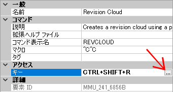 - [プロパティ]ペインで、[キー]ボックス内をクリックしてから[…]ボタンをクリックして、[ショートカット キー]ダイアログ ボックスを開きます。