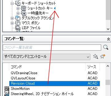 - ショートカット キーを作成するには、[コマンド一覧]ペインから、コマンドを[ <ファイル名> 内のカスタマイズ]の[ショートカット キー]ノードにドラッグします。