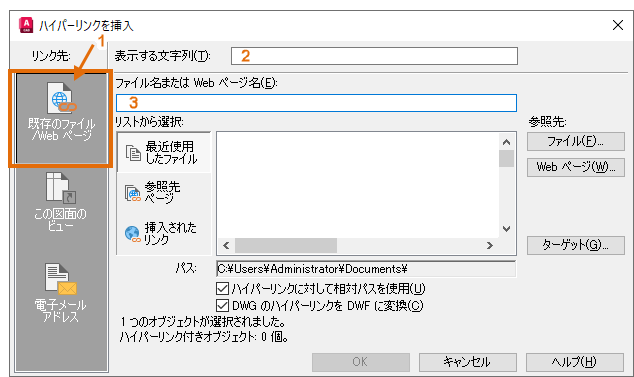 - [ハイパーリンクを挿入]ダイアログボックスで、[既存のファイル/Web ページ] (1) をクリックして、[表示する文字列]フィールド (2) に Autodesk と入力し、[ファイル名または Web ページ名]フィールド (3) に https://www.autodesk.co.jp と入力します。
