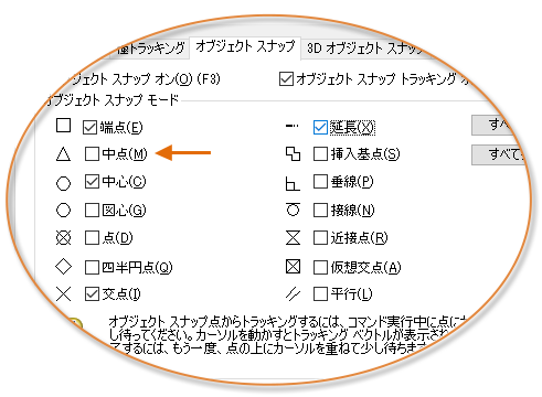 「定常オブジェクト スナップ」と呼ばれる既定のオブジェクト スナップを設定するには、OSNAP[オブジェクト スナップ設定]コマンドを使用します。たとえば、[中点]オブジェクト スナップを既定でオンにしておくと便利な場合があります。