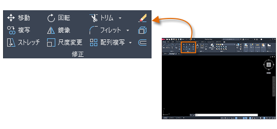 図面内のオブジェクトに対して、削除、移動、トリムなどの操作を実行します。