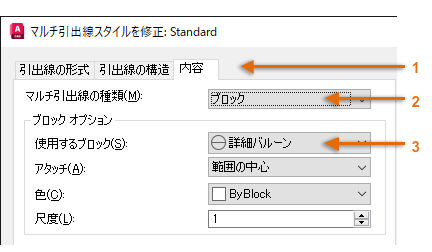 たとえば、「バルーン」を作成するには、MLEADERSTYLE[マルチ引出線スタイル管理]コマンドを開始します。[マルチ引出線スタイル管理]ダイアログ ボックスで[新規作成]をクリックし、新しいマルチ引出線スタイルの名前を決めます。[コンテンツ]タブをクリックし、[ブロック]を選択し、次に示すように[詳細バルーン]を選択します。