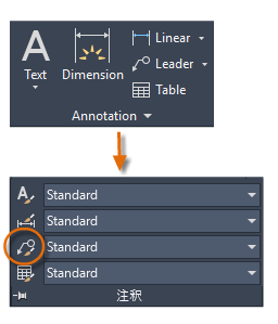 ユーザ独自のマルチ引出線スタイルは、拡張された[注釈]パネルのドロップダウン リストから、またはコマンド ウィンドウに MLEADERSTYLE と入力することで作成できます。