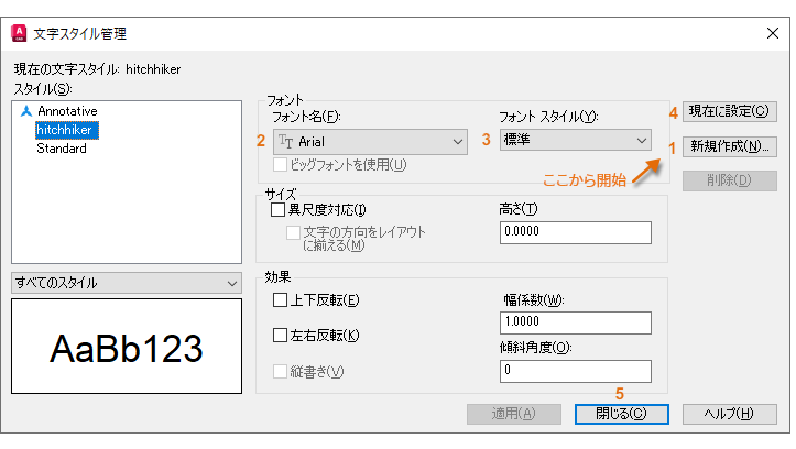 新しい文字スタイルを作成するには、次に示すように、[文字スタイル管理]コントロールをクリックします。