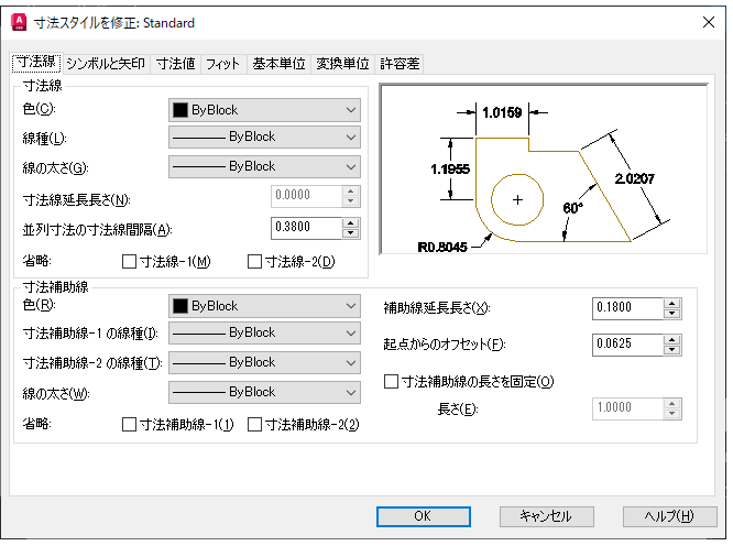 既定の寸法スタイルは、Standard (フィート/インチ)または ISO-25 (メートル)という名前です。このスタイルは、別のスタイルを現在の寸法スタイルに設定しない限り、すべての寸法に割り当てられます。
