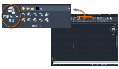 図面の編成方法を確認するには、LAYER[画層管理]コマンドを使用して、[画層プロパティ管理]を開きます。コマンド ウィンドウで LAYER または LA と入力したり、リボンの[画層プロパティ管理]ツールをクリックして表示します。