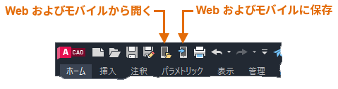 遠隔地で図面にアクセスする必要がある場合は、[Web およびモバイルに保存]および[Web およびモバイルから開く]コマンドを使用してみてください。