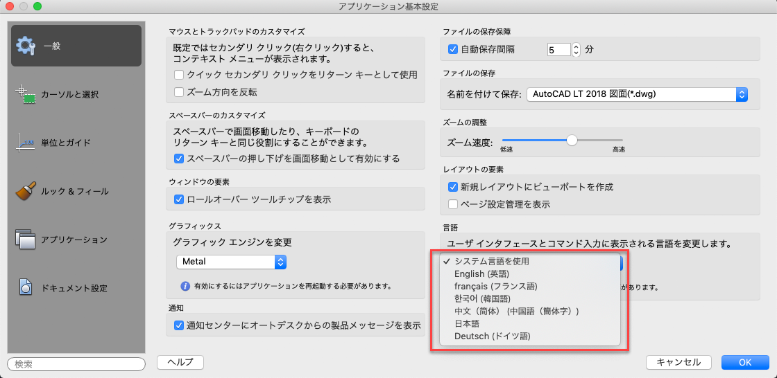 AutoCAD LT for Mac は、ドイツ語および日本語をサポートするようになりました。[アプリケーション基本設定]ダイアログで言語を変更することができます。言語の変更を確認するには、AutoCAD LT for Mac を再起動する必要があります。