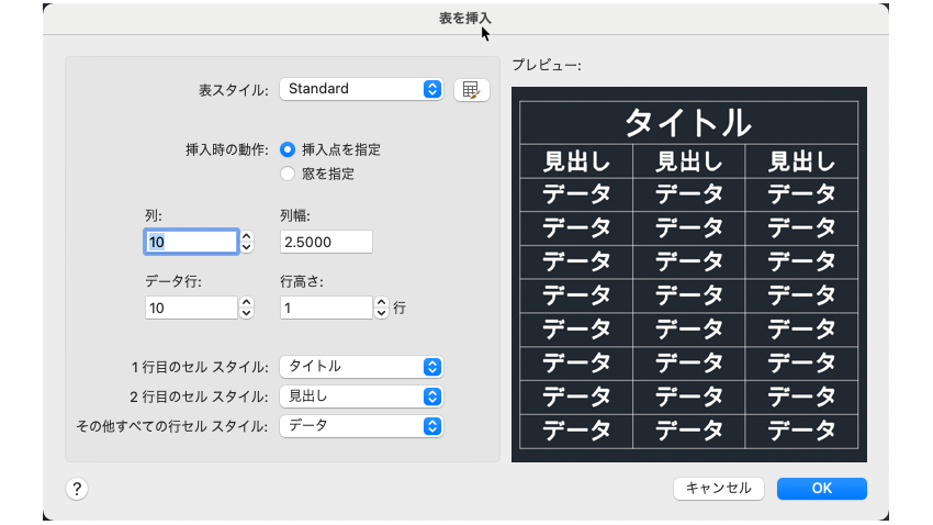 新しい[表を挿入]ダイアログ ボックスを使用して表オブジェクトを作成します。このダイアログ ボックスでは、表スタイルやセルスタイルを選択したり、行数や列数などを指定することができます。