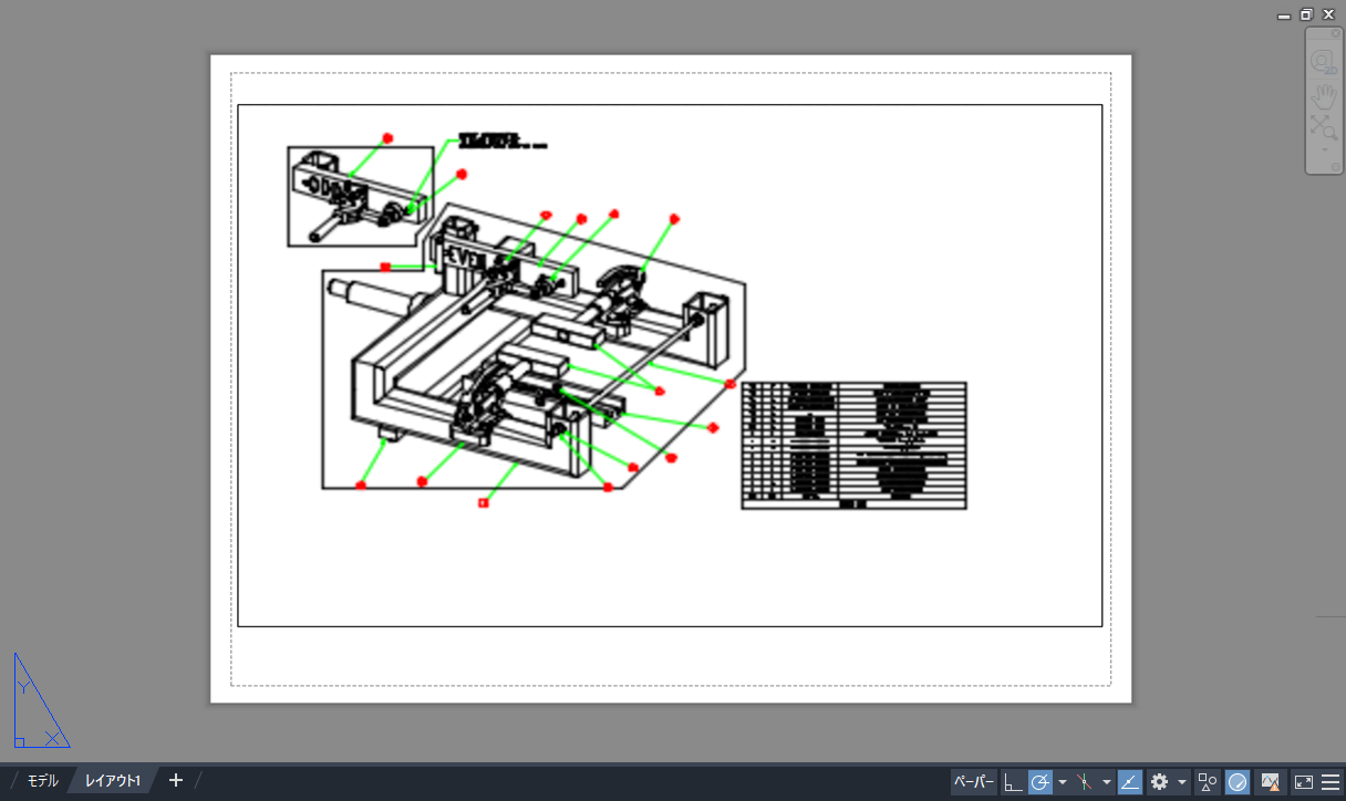 - 印刷用に図面を準備するには、ペーパー空間に切り替えます。ここでは、タイトル ブロックや注記を使用して異なるレイアウトを設定できます。また、各レイアウトには、モデル空間の異なるビューを表示するレイアウト ビューポートを作成できます。レイアウト ビューポートで、ペーパー空間を基準としてモデル空間ビューの尺度を設定します。ペーパー空間の単位は、用紙の上での実際の距離(ページ設定に応じてミリメートルまたはインチ)を表します。