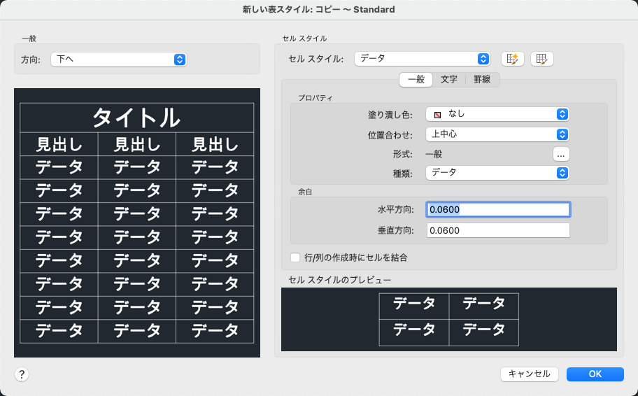 データ セル、セルの文字、セルの罫線の外観を設定します。