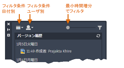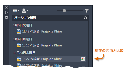 クラウドに保存されている図面のバージョン履歴が新しい[図面履歴]パレットに表示され、図面の現在のバージョンと比較することができます。