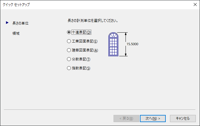 [クイック セットアップ]ウィザードには、[長さの単位]と[領域]の 2 つのページがあります。ウィザードの使用中は[戻る]ボタンと[次へ]ボタンでページを切り替えることができます。また、最後のページで[完了]ボタンをクリックすると、ウィザードを閉じて[クイック セットアップ]ウィザードで指定した設定に基づいて新しい図面を作成できます。