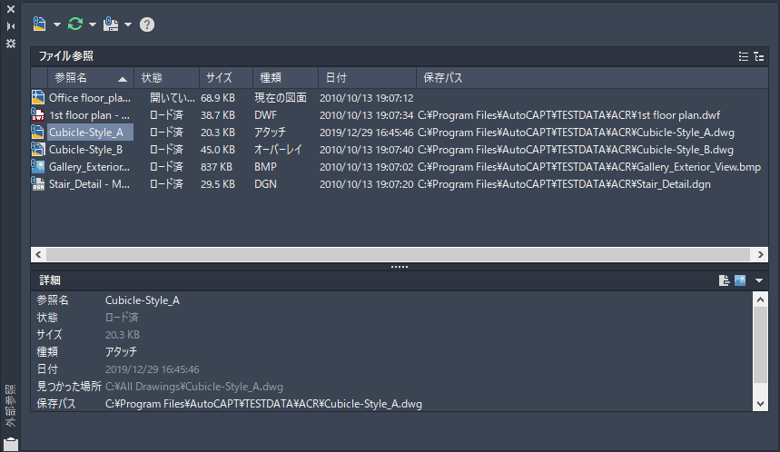 - 現在の図面内の参照一覧(ステータス、サイズ、作成日などの情報を含む)が表示されます。