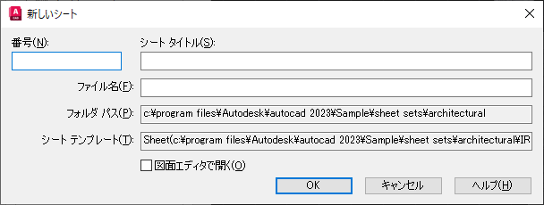 このシートを含む新しい図面ファイルの名前を指定します。既定では、図面ファイルの名前はシート タイトルとシート番号とを組み合わせたものとなります。このボックスで図面ファイル名を変更することもできます。