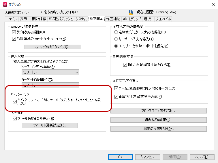 [オプション]ダイアログ ボックスの[基本設定]タブで、ハイパーリンク情報の表示を有効にします。