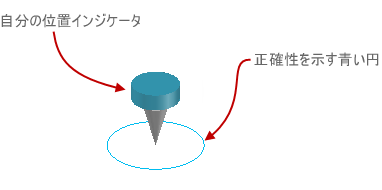 モデル空間内のユーザの現在位置に対応する位置に、[位置]インジケータが表示されます。ユーザが移動すると、[位置]インジケータも移動します。位置が正確に特定できない場合は、[位置]インジケータの周りに青い円が表示されます。円が小さければ小さいほど、精度は高くなります。